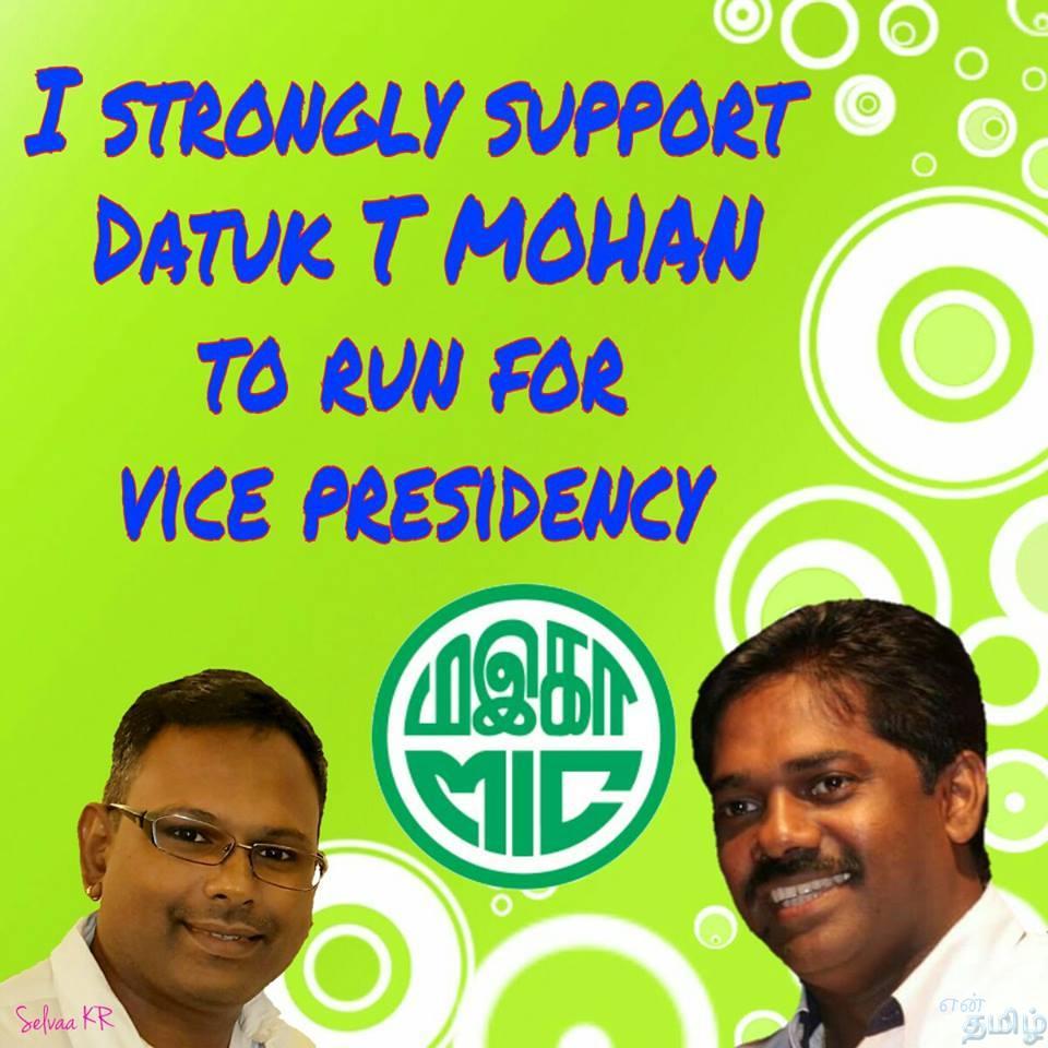 என்னைப்பொறுத்த வரையில் மஇகாவில் மாற்றங்கள் ஏற்பட்டு வரும் இந்த நேரத்தில் புதிய எழுச்சியாக இவர் உதவித்தலைவருக்கு போட்டியிட்டு வெற்றி பெற வேண்டும். இதுவே இளைஞர்கள் பலரின் எதிர்பார்ப்பாக இருக்கிறது. கட்சியை வலுப்படுத்தும் நோக்கம் நிறைவேற டத்தோ டி.மோகன் போன்ற துடிப்புமிக்க இளைஞர்கள் உயர்மட்ட பதவிகளுக்கு வர வேண்டும்.