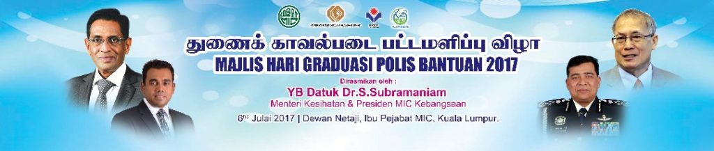 எதிர்வருகின்ற வியாழக்கிழமை 06/07/2017 அன்று மதியம் 1.30 மணி முதல் மாலை 04 மணி வரை ம.இ.கா தலைமையகத்தில் உள்ள நேதாஜி மண்டபத்தில் துணைக் காவல்படை பட்டமளிப்பு விழா 2017 நடைபெறவிருக்கிறது. மத்திய சுகாதாரத்துறை அமைச்சர் டத்தோஸ்ரீ டாக்டர் ச.சுப்ரமணியம், மத்திய மனித வள மேம்பாட்டுத் துறை அமைச்சர் டத்தோஸ்ரீ ரிச்சர்ட் ரியாட் அனாக் ஜேம், காவல் துறை ஐ.ஜி தன்ஸ்ரீ டத்தோஸ்ரீ காலித் பின் அபு பக்கர் மற்றும் ம.இ.கா தேசிய இளைஞர் பிரிவு தலைவர் டத்தோ சிவராஜ் சந்திரன் ஆகியோர் இந்த நிகழ்ச்சியில் கலந்து கொண்டு சிறப்பிக்க இருக்கிறார்கள். இந்த பட்டமளிப்பு விழாவில் மாநில இளைஞர் பிரிவு தலைவர்கள் , தொகுதி இளைஞர் பிரிவு தலைவர்கள், மாநில இளைஞர் படை தலைவர்கள், தொகுதி இளைஞர் படை தலைவர்கள் ஆகியோர் கலந்து கொண்டு விழாவை வெற்றி பெறச் செய்ய வேண்டும் என ம.இ.கா தேசிய இளைஞர் படை தலைவர் திரு. K.சுந்தரம் வெளியிட்டுள்ள அழைப்பிதழ் செய்தியில் கூறியுள்ளார்.