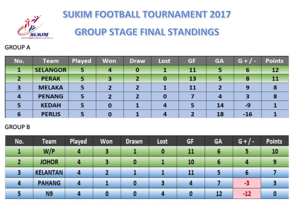 16 வயதுக்குட்பட்டோருக்கான கால்பந்து போட்டிகள் அணிகள் இரண்டாக பிரித்து கடந்த 4 நாட்கள் நடந்தன. ஆரம்ப சுற்று போட்டிகள் இன்றுடன் முடிந்தன. நடந்த போட்டிகளின் புள்ளிகள் அடிப்படையில் இறுதி பட்டியல் முடிவானது. இந்த போட்டிகளின் முடிவுகளை பொறுத்து முதல் நான்கு அணிகள் அரை இறுதி போட்டியில் நாளை 08/07/2017 அன்று மோதுகின்றன. இதன் அடிப்படையில் அரை இறுதிக்கு சிலாங்கூர், ஜோகூர், பேராக் மற்றும் கூட்டரசு பிரதேச அணிகள் தகுதி பெற்றுள்ளன.
