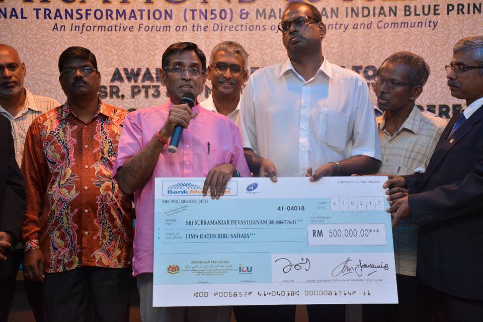 அந்த மண்டபம் பத்து பெரண்டாமிலுள்ள ஸ்ரீ சுப்பிரமணியர் தேவஸ்தான வளாகத்தில் கட்டப்படும். அதன் கட்டுமானப் பணிகளுக்காக அரசாங்கம் ஐந்து லட்சம் ரிங்கிட்டை வழங்கியுள்ளது. அதற்கான மாதிரி காசோலை வழங்கும் நிகழ்ச்சி இன்று 20/07/2017 மலாக்காவில் நடைபெற்றது. சுகாதார அமைச்சருமான டத்தோஸ்ரீ சுப்பிரமணியம் அதற்கான மாதிரி காசோலையை பத்து பெரண்டம் ஸ்ரீ சுப்பிரமணியர் தேவஸ்தான தலைவர் திரு. மனோகரன் அவர்களிடம் வழங்கினார். இந்நிகழ்வில் தேவஸ்தான பொறுப்பாளர்களுடன், மாநில ம இ கா தலைவர்களும் சமூக இயக்கங்களின் பொறுப்பாளர்களும் திரளாக கலந்து சிறப்பித்தனர்.
