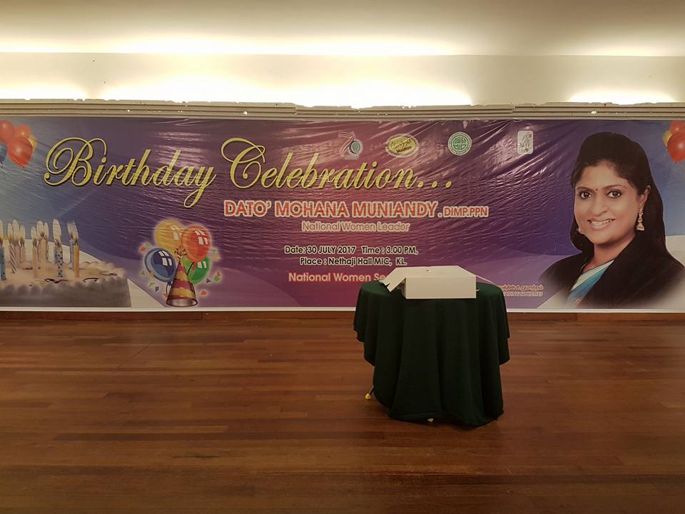 ம.இ.கா தேசிய மகளிர் பிரிவு தலைவி டத்தோ திருமதி மோகனா முனியாண்டி யின் பிறந்தநாள் விழா 30/07/2017 ம.இ.கா தலைமையகத்தில் கொண்டாடப்பட்டது. ம.இ.கா தேசிய தலைவர் டத்தோஸ்ரீ டாக்டர் ச.சுப்ரமணியம் மற்றும் பல தலைவர்களும் விழாவில் கலந்துகொண்டு மோகனா முனியாண்டிக்கு தங்களின் பிறந்தநாள் வாழ்த்துக்களை தெரிவித்துக் கொண்டனர். ம.இ.கா மகளிர் பிரிவு தலைவர்களும் தொண்டர்களும் நிகழ்வில் கலந்து கொண்டு தங்கள் தலைவிக்கு பிறந்தநாள் வாழ்த்துக்களை தெரிவித்துக் கொண்டனர்.