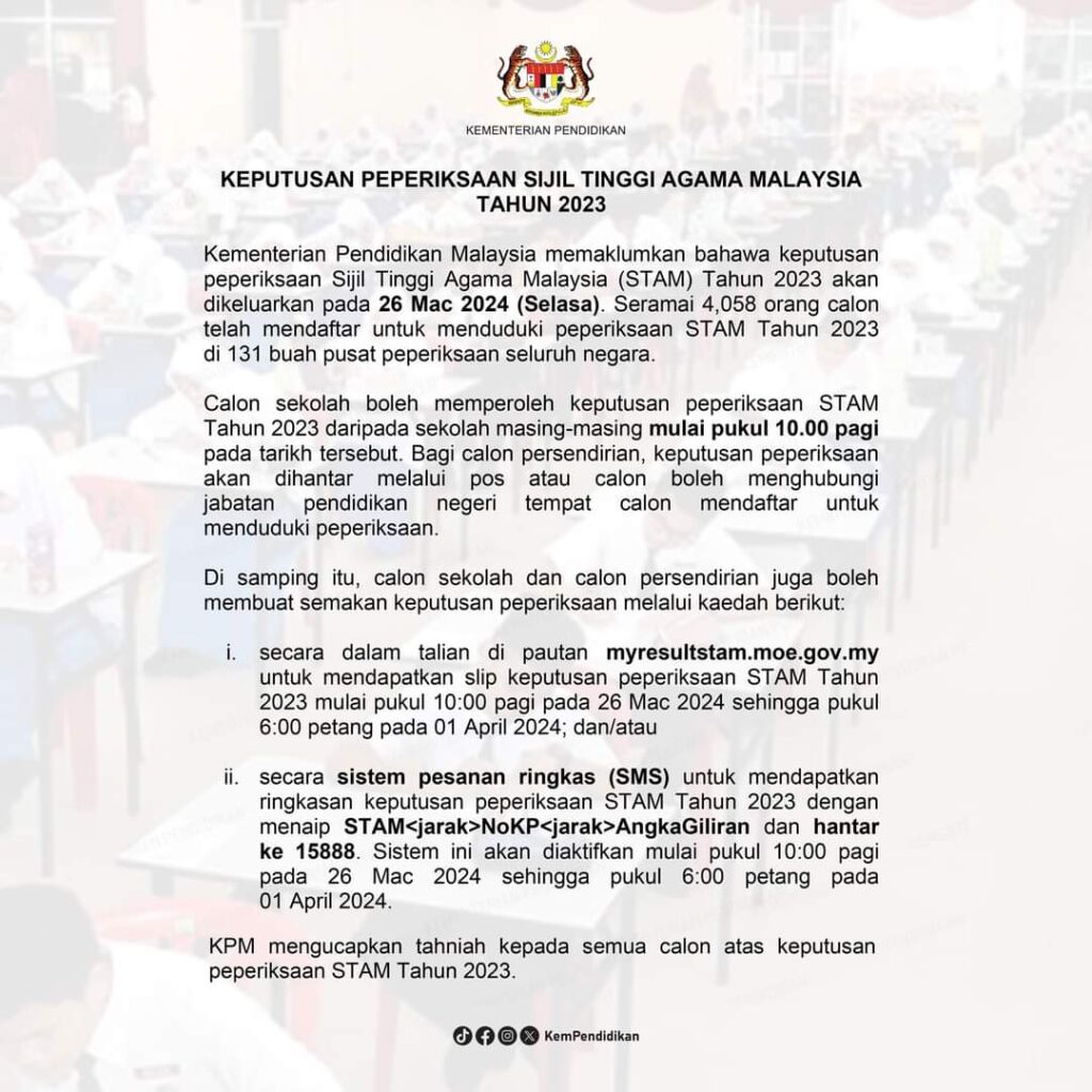 Keputusan Peperiksaan Sijil Tinggi Agama Malaysia (STAM) Tahun 2023 akan dikeluarkan pada Selasa, 26 Mac 2024.