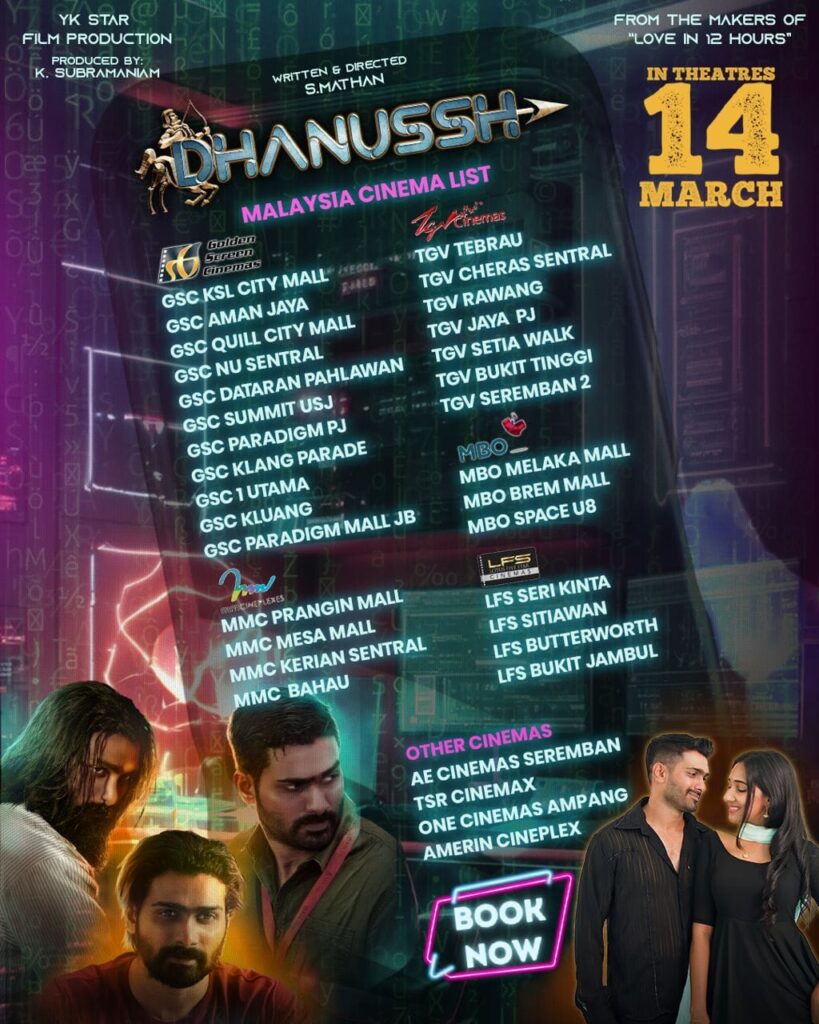 Cinema Listing of brand new feature film titled “Dhanussh” directed by the same director of Love in 12 hours, S.Mathan and main lead by our most charming lover boy Mano alongside with everlasting beauty Yasmin Nadiah. Music track done by none other than Lingges who stole our heart by his heartwarming song and bgm through Love in 12 hours. You can expect the release of Dhanussh on 14th March 2024 at Malaysia cinemas.