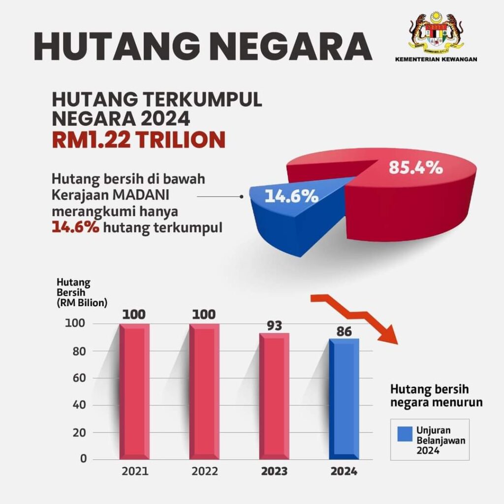Although the MADANI Government has increased development spending, the increase in new net debt has slowed from RM100 billion in 2021 and 2022 to the projected RM86 billion for this year.