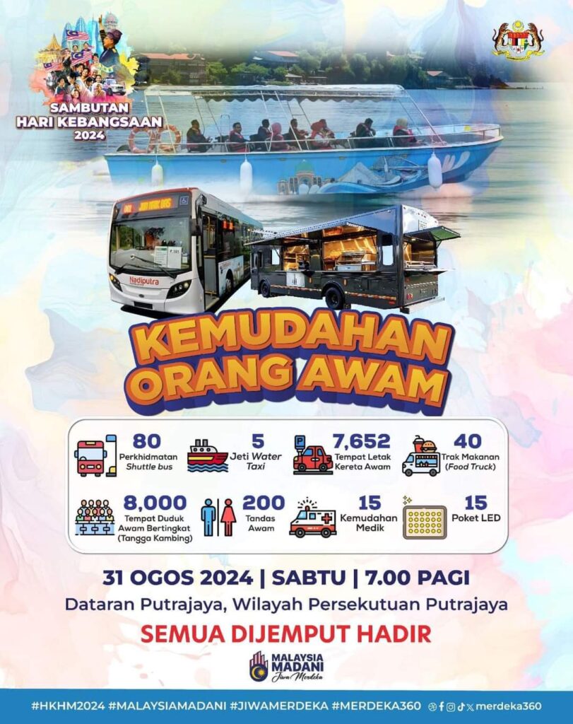 2024 தேசிய தின கொண்டாட்டத்தை முன்னிட்டு புத்ராஜெயா சதுக்கத்திற்குச் செல்லும் பொது போக்குவரத்து சேவைகளும் மற்றும் சதுக்கத்தில் மக்களுக்காக பல்வேறு பொது வசதிகள் ஏற்பாடு செய்யப்பட்டுள்ளன.