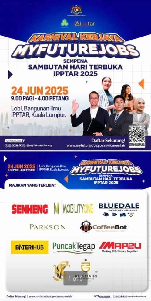 இந்த நிகழ்வை PERKESO மற்றும் IPPTAR இணைந்து நடத்துகின்றன. இங்கே 10 முக்கிய நிறுவனங்கள் நேரடி நேர்காணல்களுக்கு கலந்து கொள்கின்றன. நீங்கள் நேரடியாக வேலை வாய்ப்புக்காக நேர்காணலில் பங்கேற்க முடியும்.