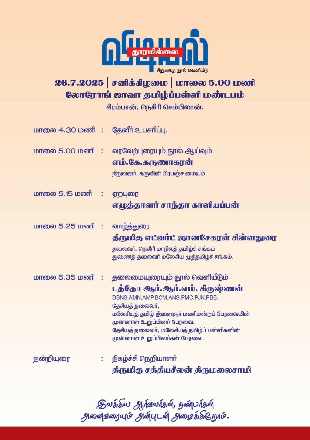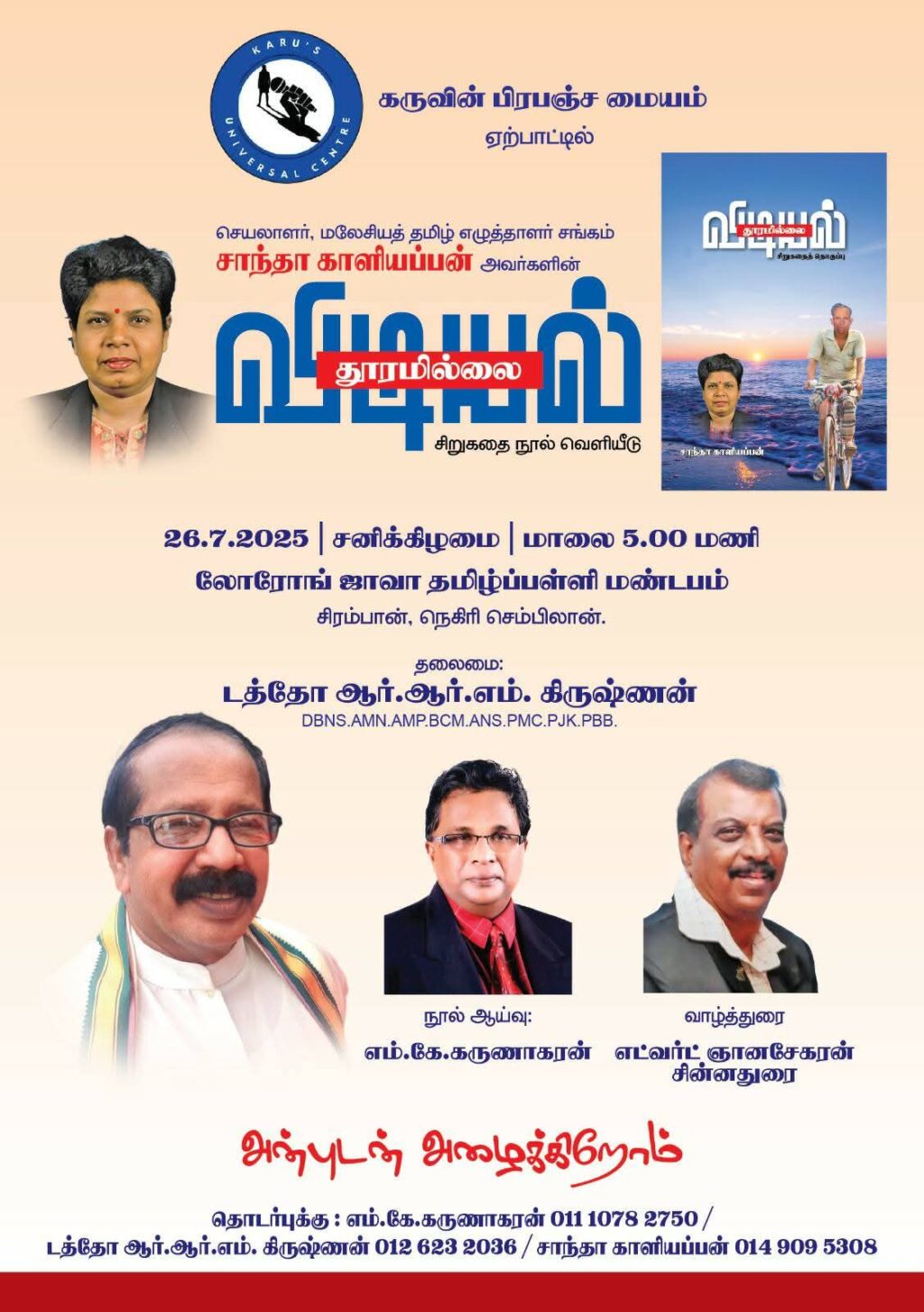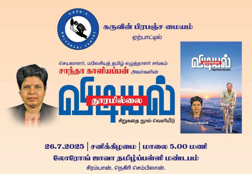 சிரம்பான், 01 ஜூலை 2025 : மலேசியத் தமிழ் இலக்கிய உலகில் முக்கிய இடம் வகிக்கும் எழுத்தாளர் சாந்தா காளியப்பன் அவர்களின் புதிய சிறுகதைத் தொகுப்பு ‘விடியலைத் துரமில்லை’ நூல் வெளியீட்டு விழா, எதிர்வரும் 26 ஜூலை 2025 (சனிக்கிழமை) மாலை 5.00 மணிக்கு லோரோங் ஜாவா தமிழ்ப்பள்ளி மண்டபத்தில், சிரம்பானில் நடைபெற உள்ளது.