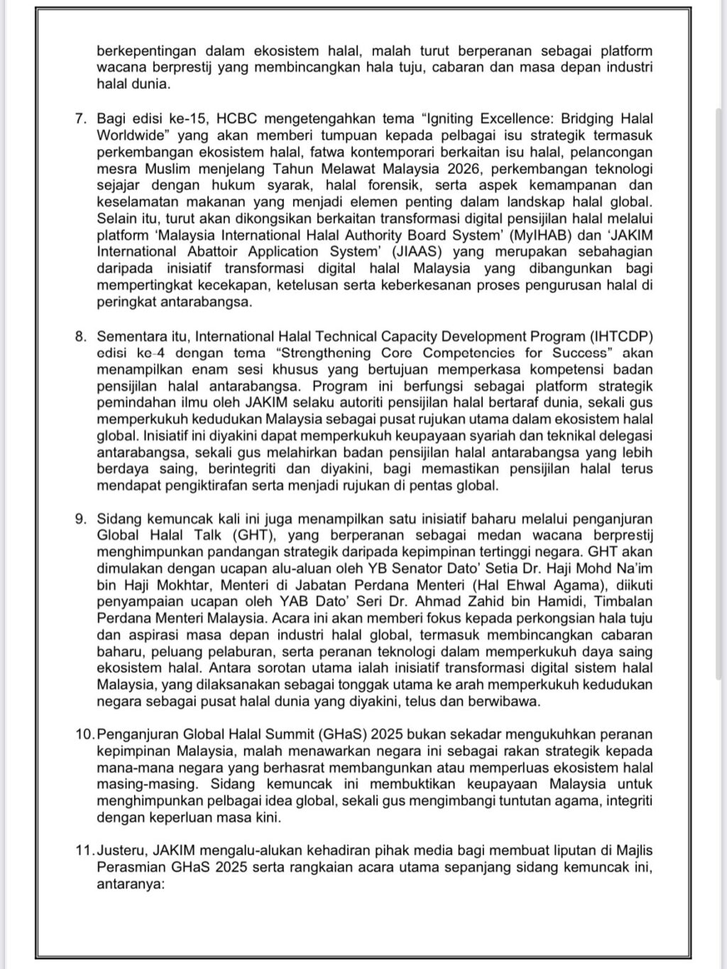 புத்ராஜெயாவில் நடைபெறும் உலகளாவிய ஹலால் வணிக மாநாடு (WHBC), மலேசியா சர்வதேச ஹலால் காட்சிப்படுத்தல் (MIHAS) மற்றும் மலேசியா சர்வதேச ஹலால் ஆராய்ச்சி மற்றும் கல்வி மாநாடு (MHIREC) 2025 மற்றும் MITEC கோலாலம்பூரில் நடைபெறும் பிற சிறப்பம்சங்கள் ஆகும்.
