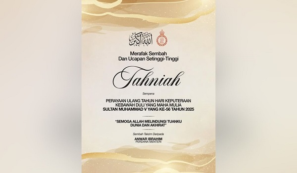 கோலாலம்பூர், 29 செப்டம்பர்2025 : கிளந்தான் சுல்தான் ஐந்தாம் சுல்தான் முகமதுவின் 56வது பிறந்தநாள் கொண்டாட்டத்தை முன்னிட்டு பிரதமர் டத்தோஸ்ரீ அன்வார் இப்ராஹிம் இன்று தனது வாழ்த்துக்களைத் தெரிவித்தார்.