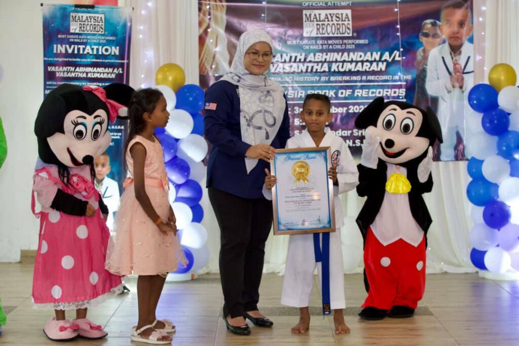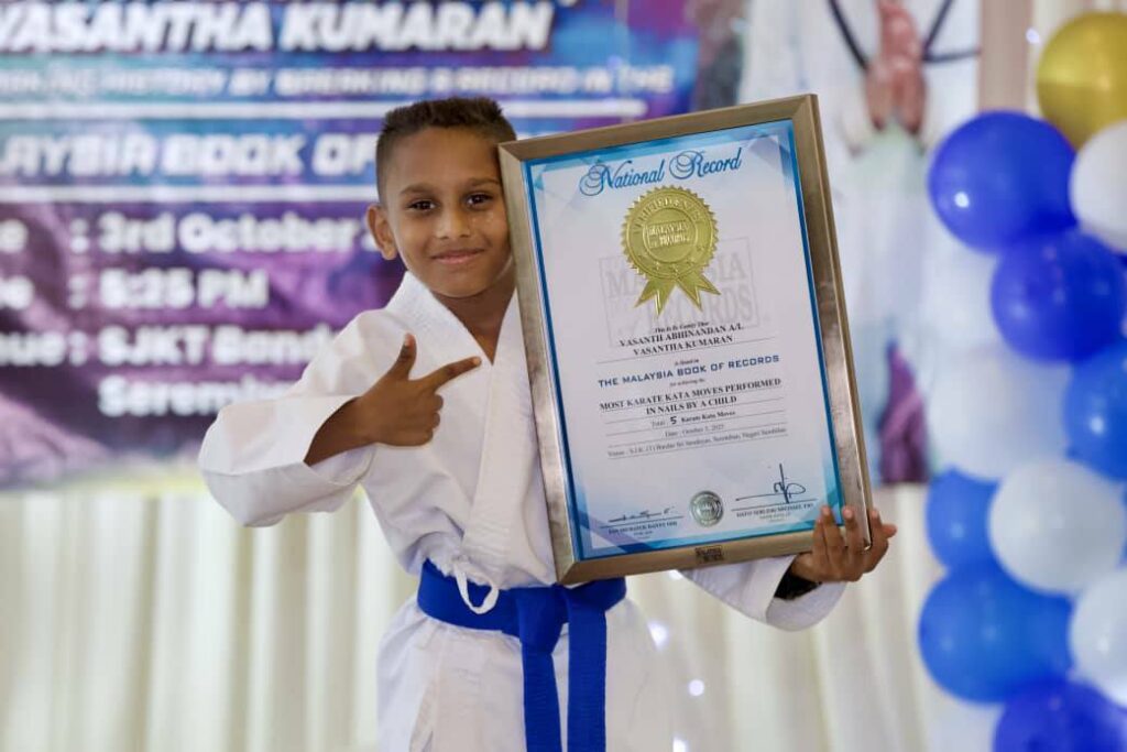 அவர் ஆணி பதகை “நெயில் ஸ்லிப்பர்” அணிந்து தொடர்ந்து 10 நிமிடங்கள் கராத்தே கத்தா (Karate Kata) அசைவுகளை திறம்பட செய்து, மலேசிய சாதனைப் புத்தகத்தில் (Malaysia Book of Records) இடம் பெற்றுள்ளார்.