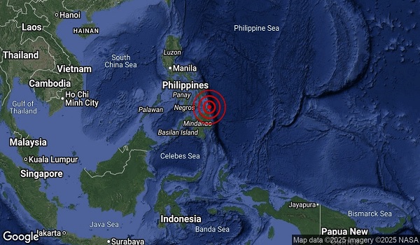 மலேசிய வானிலை ஆய்வு மையம் (METMalaysia) ஒரு அறிக்கையில், இந்த நிலநடுக்கம் பிலிப்பைன்ஸின் சூரிகாவ் நகரத்திலிருந்து சுமார் 76 கிலோமீட்டர் (கிமீ) கிழக்கே 9.8 டிகிரி வடக்கு மற்றும் 126.2 டிகிரி கிழக்கே மையம் கொண்டிருந்ததாக அறிவித்தது.