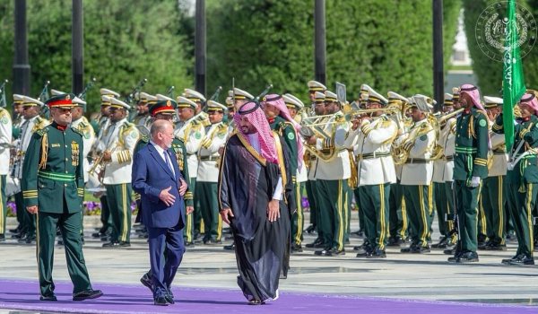 மரியாதைக்குரிய அடையாளமாக, சவூதி அரேபியாவின் தேசிய கீதம் மற்றும் நெகாராகு பாடல் இசைக்கப்பட்டது, அதற்கு முன்பு இளவரசர் முகமது பின் சல்மானுடன் மாட்சிமை தங்கிய மன்னர், மரியாதைக் காவல் வழியாக அரண்மனைக்குள் நுழைந்தார்.