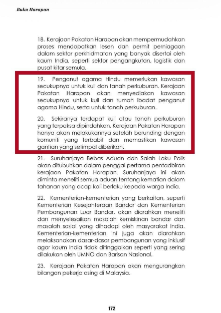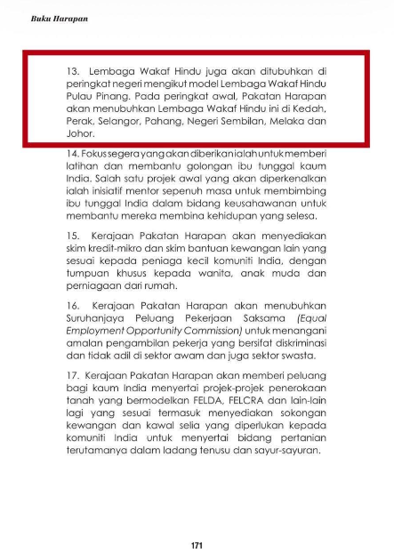 உண்மையில், Buku Harapan இல் வழங்கப்பட்ட வாக்குறுதிகள் ஆரம்பத்திலேயே நிறைவேற்றப்பட்டிருந்தால் — குறிப்பாக அனைத்து மாநிலங்களிலும் இந்து வக்ஃப் வாரியம் அமைத்தல், போதுமான நிலம் வழங்குதல், மேலும் நியாயமான மற்றும் ஒழுங்குபடுத்தப்பட்ட சட்டப்பூர்வப்படுத்தும் (regularisation) செயல்முறை அமல்படுத்துதல் — இன்றைய பதற்றமான நிலை உருவாகியிருக்காது.