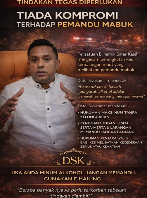 கோலாலம்பூர், 30 மார்ச் 2026 : டைனமிக் சினார் காசிஹ் சங்கம், மதுபோதையில் வாகனம் ஓட்டுவதால் அதிகரித்து வரும் விபத்துகளை கடுமையாக கண்டித்துள்ளது. சமீபத்தில் நடந்த விபத்தில் ஒரு நிர்பந்தமற்ற நபர் உயிரிழந்த சம்பவம், நிலவும் குறைபாடுகளை வெளிப்படுத்துவதாக சங்கம் தெரிவித்துள்ளது.