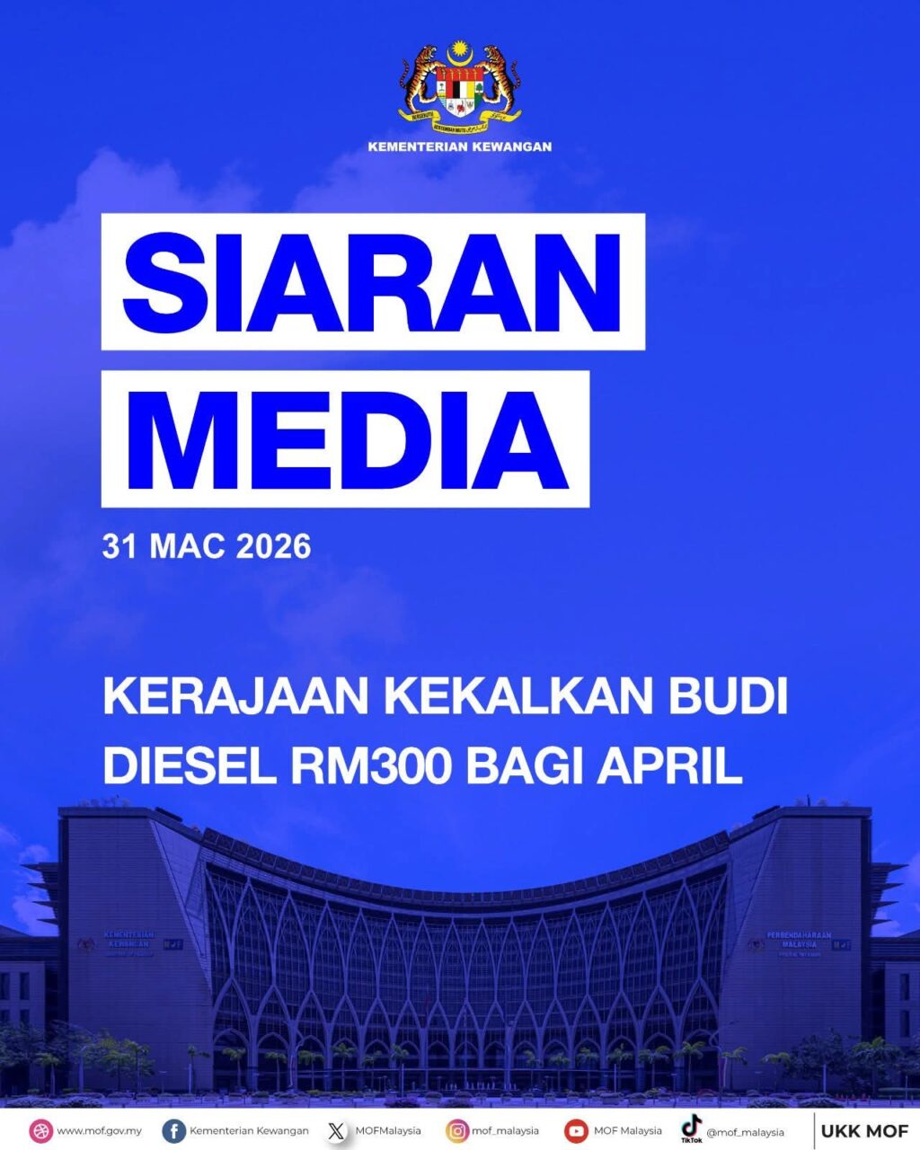 புத்ரஜெயா, 31 மார்ச் 2026 : உலகளாவிய வேலைவாய்ப்பு சந்தையின் நிலைமை மேலும் உறுதியற்றதாக மாறி வரும் நிலையில், பொதுமக்களின் வாழ்வாதாரச் சுமையை குறைக்கும் நோக்கில் BUDI MADANI டீசல் திட்டத்தின் கீழ் வழங்கப்படும் உதவித்தொகையை அதிகரிக்க மலேசிய அரசு முடிவு செய்துள்ளது.
