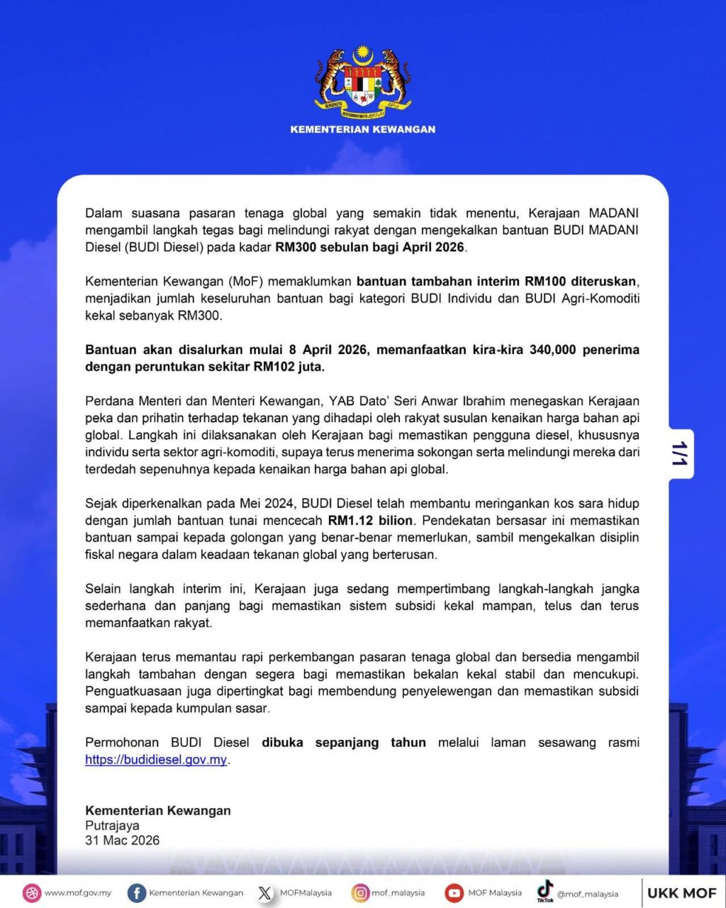 இதன்படி, 2026 ஏப்ரல் மாதத்திற்கான BUDI டீசல் உதவி RM300 ஆக உயர்த்தப்பட்டுள்ளது. இதனுடன் கூடுதலாக RM100 வழங்கப்படுவதால், BUDI தனிநபர் மற்றும் BUDI வேளாண்-பொருள் பிரிவுகளுக்கான மொத்த உதவி RM300 ஆக நிர்ணயிக்கப்பட்டுள்ளது.