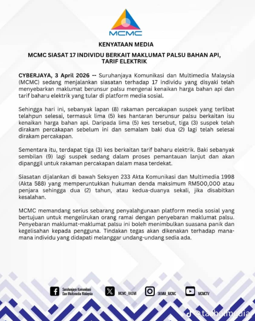 சைபர்ஜெயா, 03 ஏப்ரல் 2026 : MCMC சமூக வலைதளங்களில் எரிபொருள் விலை உயர்வு மற்றும் மின்சார கட்டண உயர்வு குறித்து தவறான தகவல்களை பரப்பியதாக சந்தேகிக்கப்படும் 17 நபர்களுக்கு எதிராக விசாரணை நடத்தி வருகிறது.