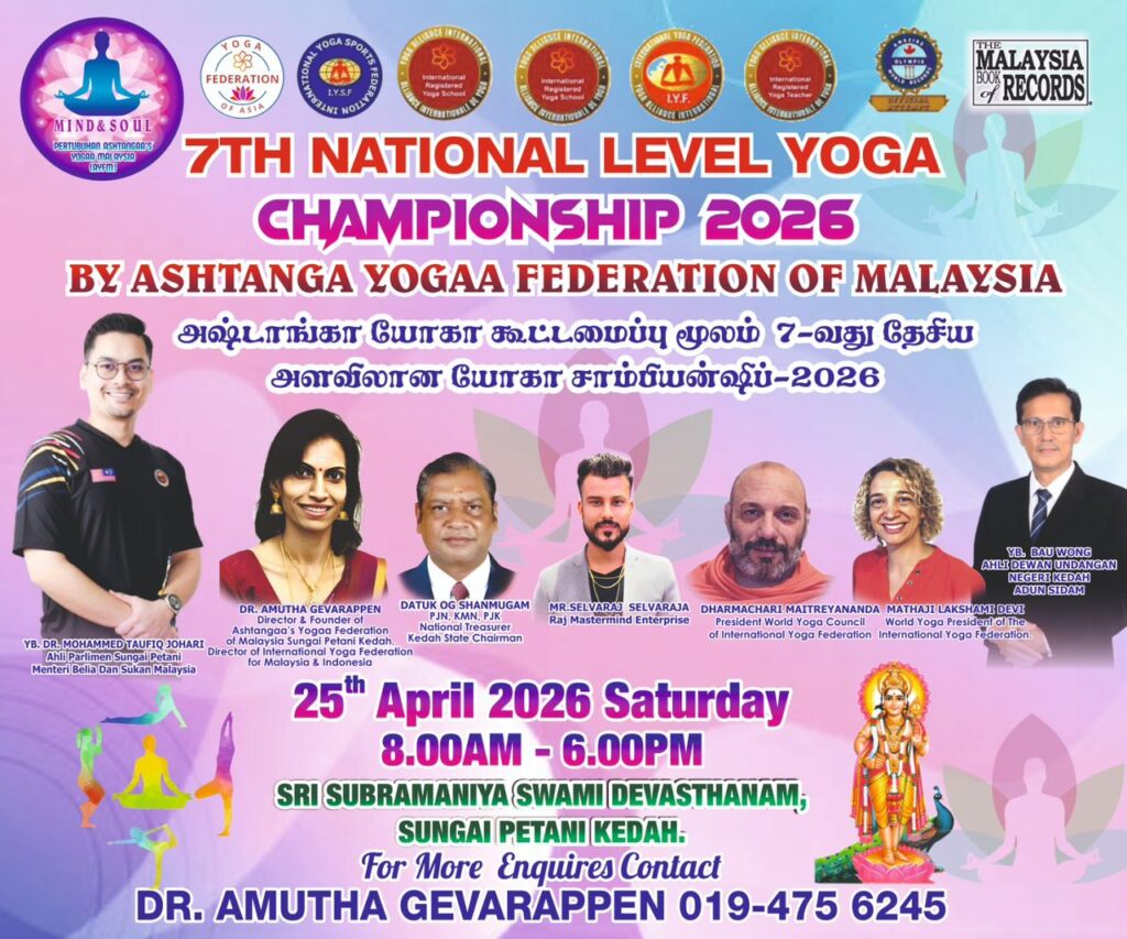 கெடா, 09 ஏப்ரல் 2026 : மலேசியாவின் அஷ்டாங்க யோகா சம்மேளனம் (Ashtanga Yoga Federation of Malaysia) ஏற்பாட்டில் 7வது தேசிய அளவிலான யோகா சாம்பியன்ஷிப் 2026 நடைபெற உள்ளது. இந்த சிறப்புமிக்க நிகழ்வு வரும் ஏப்ரல் 25, 2026 (சனிக்கிழமை) காலை 8.00 மணி முதல் மாலை 6.00 மணி வரை நடைபெறும்.