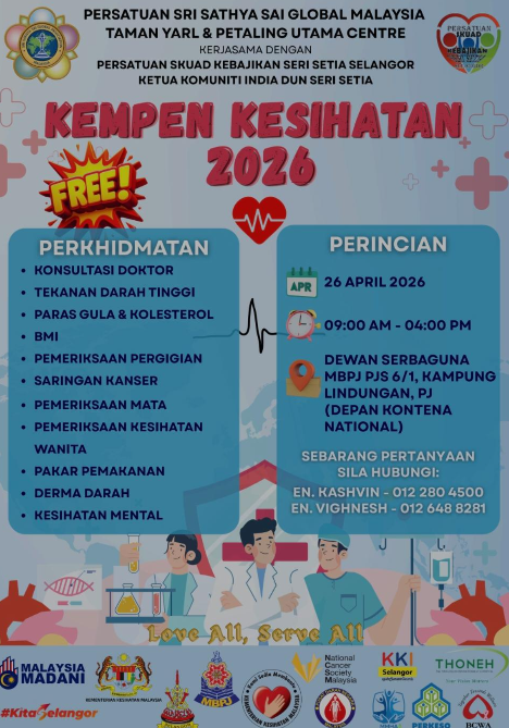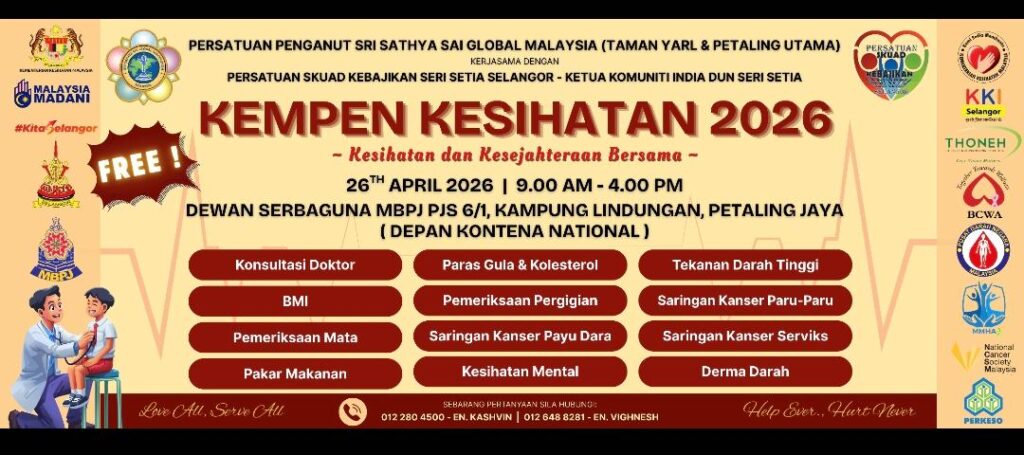 14 ஏப்ரல் 2026 : பொதுமக்களின் சுகாதார விழிப்புணர்வை மேம்படுத்தும் நோக்கில், “இலவச மருத்துவ முகாம் 2026” நிகழ்ச்சி வருகிற ஏப்ரல் 26ஆம் தேதி பேட்டாலிங் ஜெயாவில் நடைபெற உள்ளது.