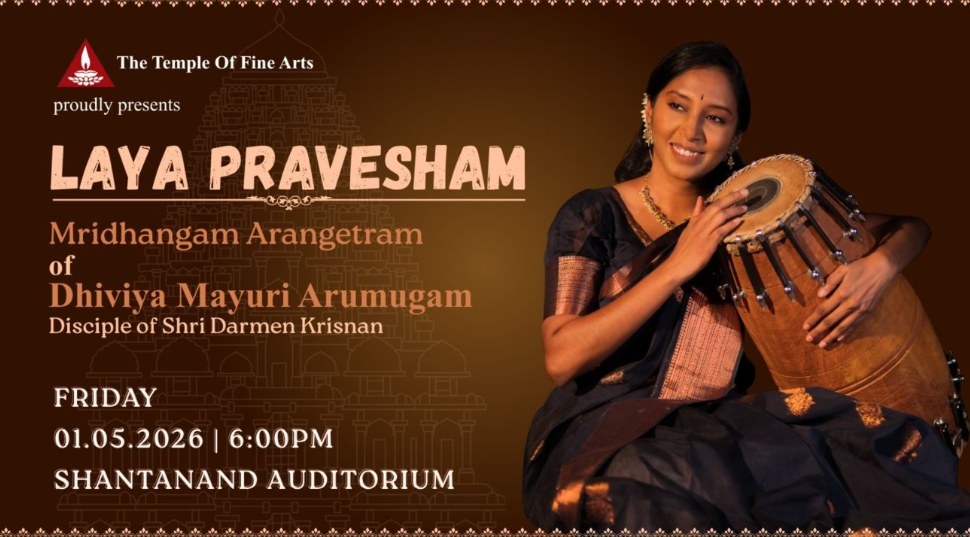 தி டெம்பிள் ஆஃப் பைன் ஆர்ட்ஸ் ஏற்பாடு செய்யும் இந்த நிகழ்வில், ஸ்ரீ தர்மன் கிருஷ்ணனின் சீடையான திவ்யா மயூரி ஆறுமுகம் தனது இசைப் பயணத்தின் முக்கிய மைல்கல்லை எட்டவுள்ளார்.