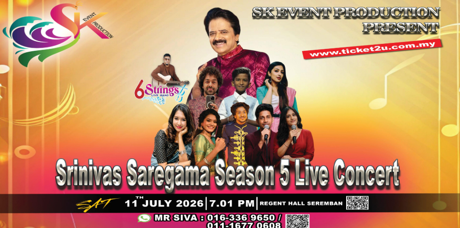 For tickets : https://www.ticket2u.com.my/event/49422/srinivas-saregama-season-5-live-concert