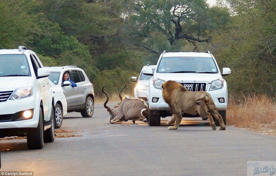 ஜூலை 15, தென் ஆப்பிரிக்காவின் க்ரூகர் பார்க்கில். அங்கு சிங்கங்களை பார்ப்பதற்காக பிரத்தியேக கார் சபாரி வசதி உண்டு. சுற்றுலாப் பயணிகள் அந்த காரில் சென்று கொண்டிருக்கும் போது, திடீரென ஒரு காட்டுமான் சாலைக்குள் புகுந்து காரில் மோதியது. காரணம் அந்த மானை விரட்டியபடி, ஒரு சிங்கமும் வந்தது.
