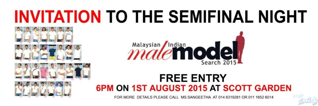 மலேசிய இந்திய ஆண் மாதிரி தேடல் 2015 July 31, 2015 ஜூலை 31, அரையிறுதியில் இரவு அழைப்பு 1-8-2015 மாலை 6மணிக்கு ஸ்காட் தோட்டத்தில் நடைபெறும். நுழைவு கட்டணம் இலவசம். விவரங்களுக்கு சங்கீதா: 014 6319281 011 16526014