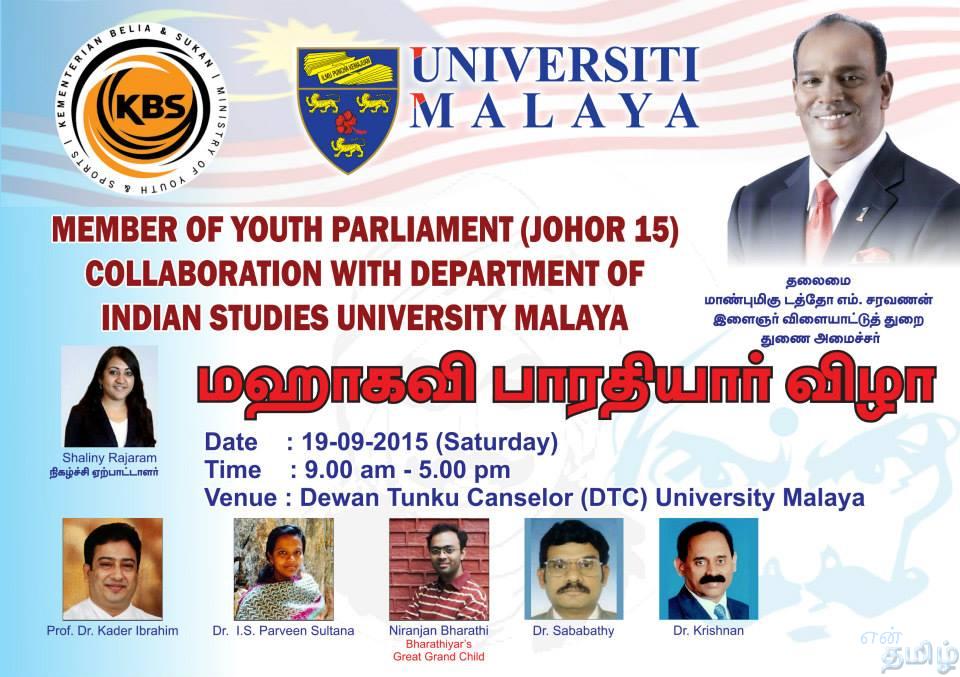 மஹாகவி பாரதியார் விழா September 1, 2015 செப்டம்பர் 1, மஹாகவி பாரதியார் விழா வரும் சனிக்கிழமை காலை 9மணி முதல் மாலை 5மணி வரை திவான் துங்கு பல்கலைக்கழக மலேயாவில் நடைபெறுகிறது. தலைமை டத்தோ எம்.சரவணன் இளைஞர் விளையாட்டுத் துறை துணை அமைச்சர்.